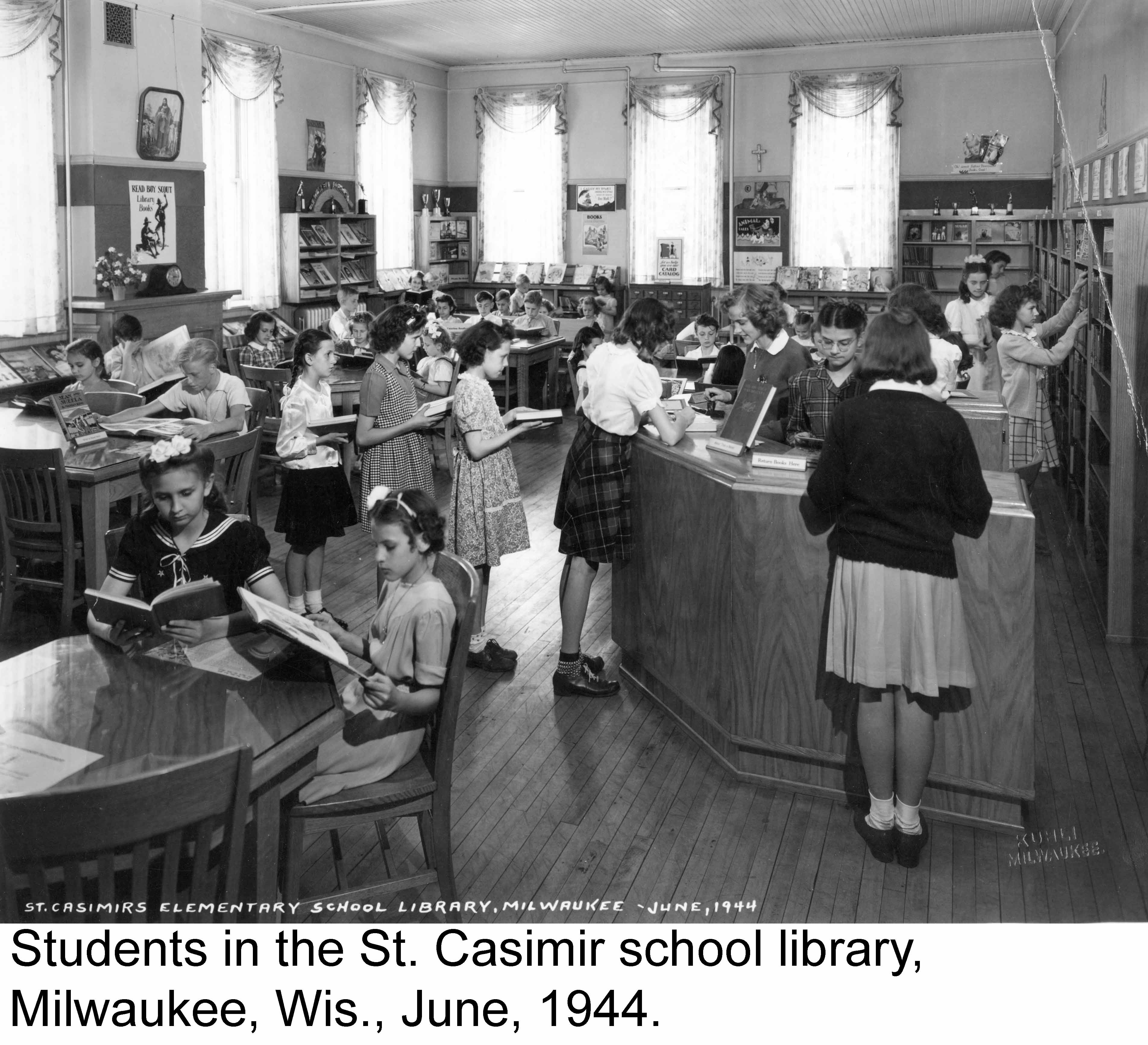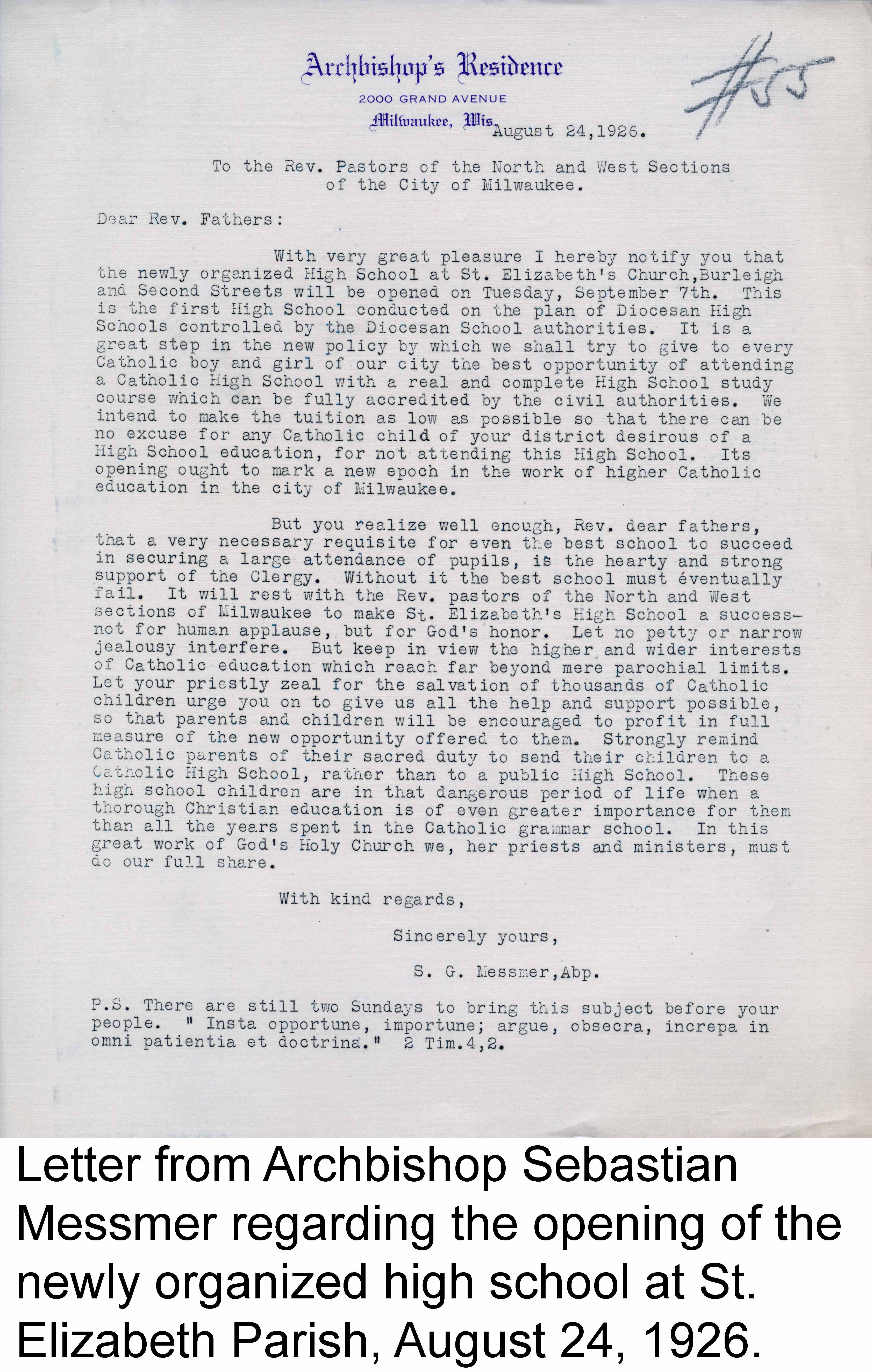 Messmer High School, the first diocesan high school, was opened on 8th and Capitol Dr. The school originated at St. Elizabeth, but in 1930 opened in it's present location. By the early 1940’s, it was running double shifts of classes to accommodate student demand.
