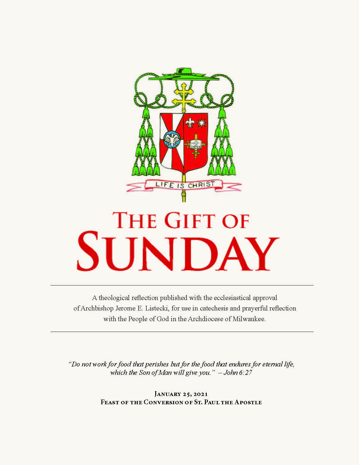 The Gift of Sunday is a theological reflection published with the ecclesiastical approval of Archbishop Jerome E. Listecki, for use in catechesis and prayerful reflection.
